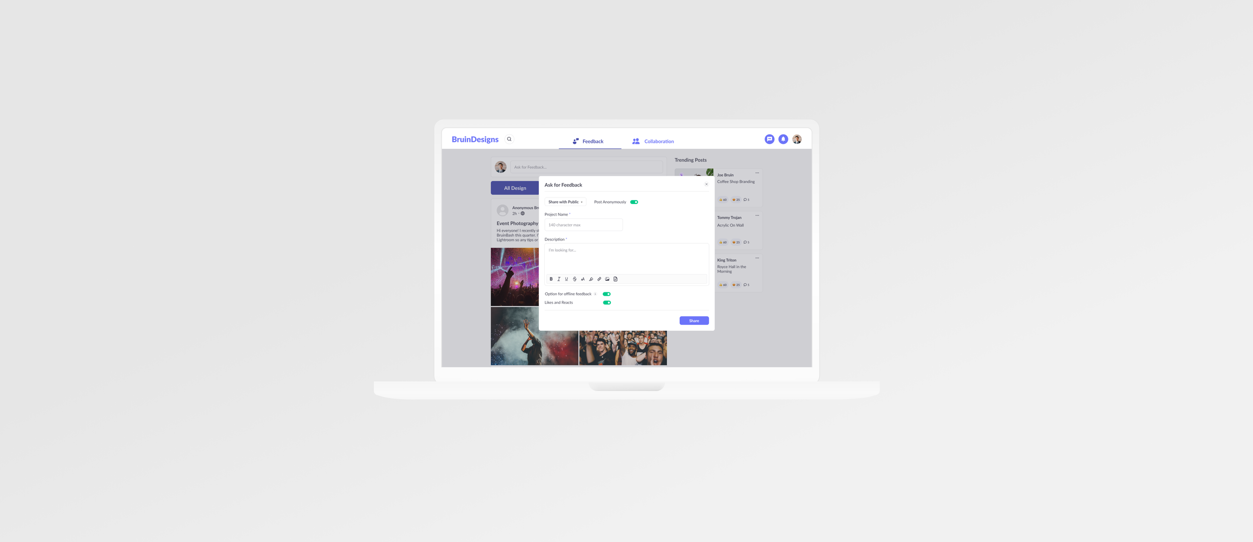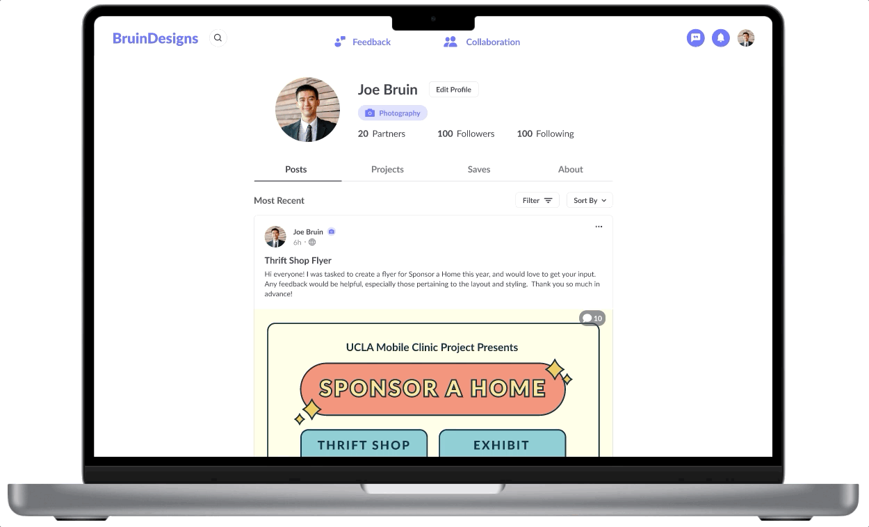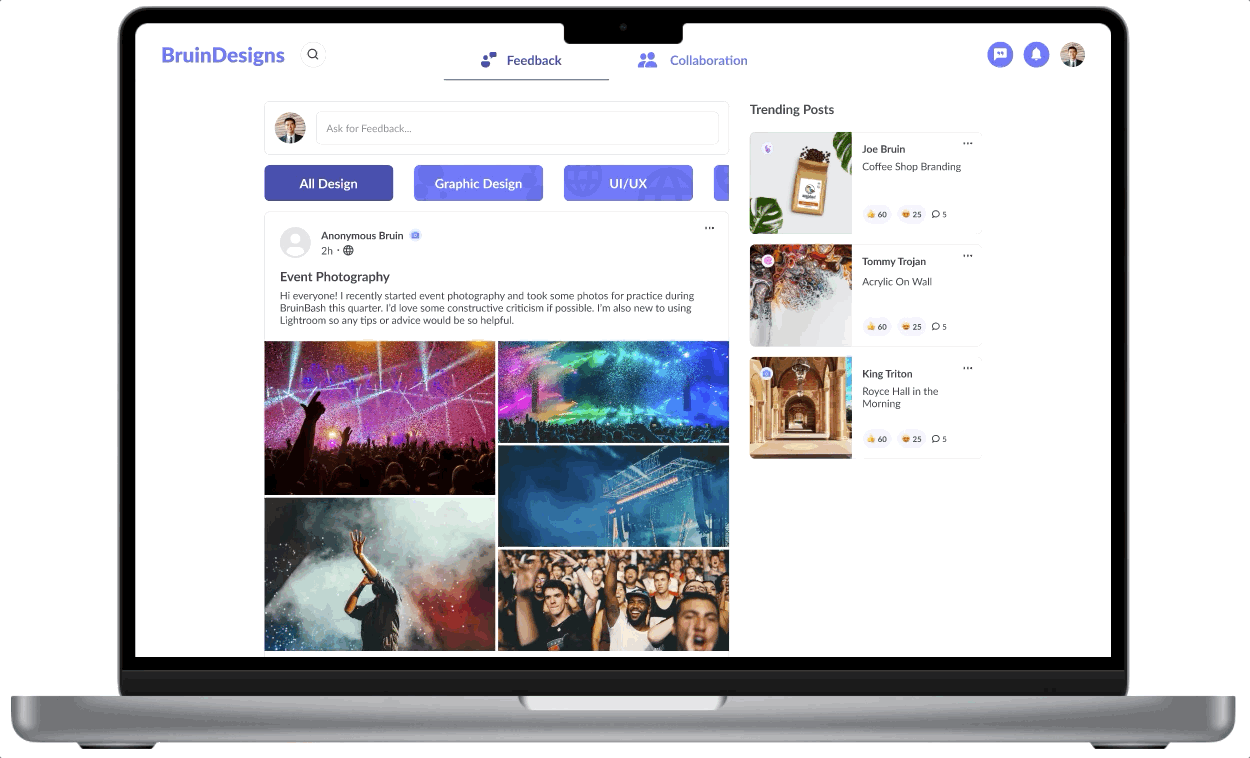 A community-building platform for students at UCLA to give and receive feedback, and collaborate on design projects